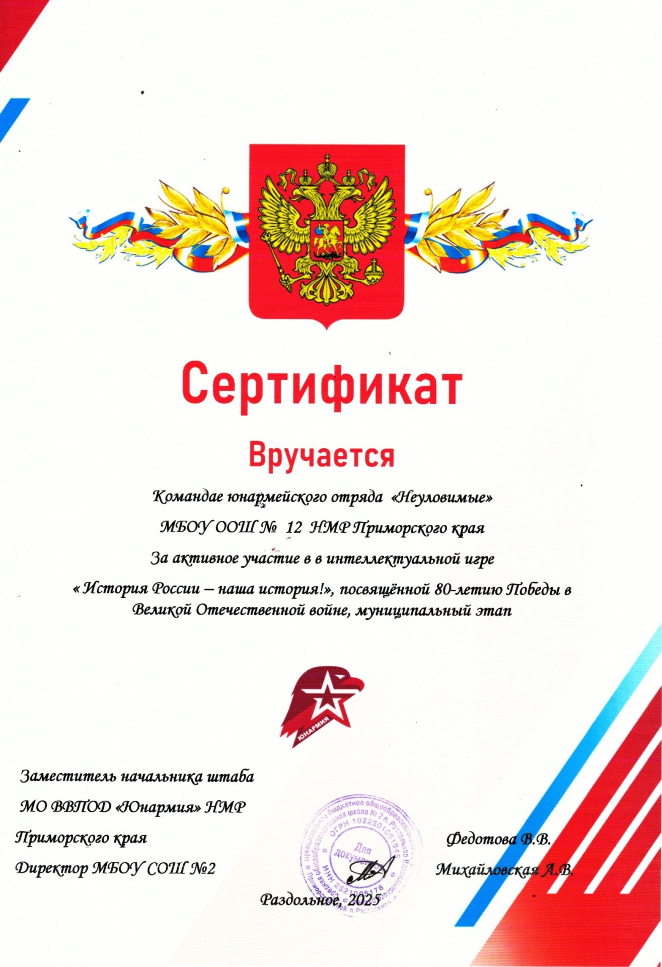 Наш юнармейкий отряд "Неуловимые" принял участие в интеллектуальной игре "История России - наша история!", посвященной 80-летию победы в Великой Отечественной войне среди юнармейских отрядов Надеждинского района.